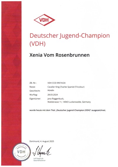 | 01.08.2025 | 18. CACIB Oldenburg | Jugendklasse | Dr. R. Schill (RO) | V1, JCAC, JCAC-VDH, JCACIB - und damit Bedingungen erfüllt für den VDH- Jugendchampion |