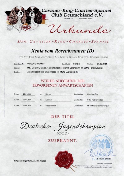 | 17.05.2025 | 46. CACIB - Rieden - Kreuth | Jugendklasse | M.J. Melchior-Schlechter (Lux) | V1, JCAC, JCAC-VDH, JCACIB, Frankenjugend-Sieger, Alpenjugendsieger - und damit Bedingungen erfüllt für den CCD-Jugendchampion |