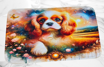 Fußmatte vorn: Cavaliermotiv hinten: beige mit Antirutschnoppen Größe: 80cm x 48cm Preis: 12,-€ verfügbar: 2 Stück